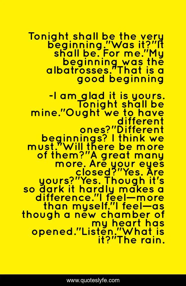 "I am glad it is yours. Tonight shall be mine.''Ought we to have different ones?''Different beginnings? I think we must.''Will there be more of them?''A great many more. Are your eyes closed?''Yes. Are yours?''Yes. Though it's so dark it hardly makes a difference.''I feel—more than myself.''I feel—as though a new chamber of my heart has opened.''Listen.''What is it?''The rain. Quotes." Quoteslyfe.com, 2025. Sun. 07 Dec. 2025. <https://www.quoteslyfe.com/quote/Tonight-shall-be-the-very-beginning-Was-81341>.