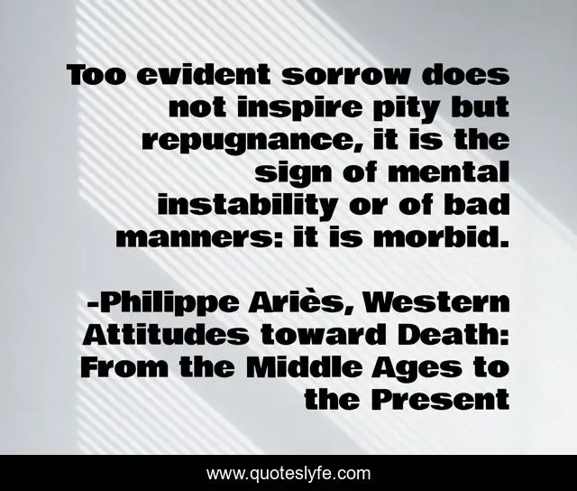 This page presents the quote "Too evident sorrow does not inspire pity but repugnance, it is the sign of mental instability or of bad manners: it is morbid.". Author of this quote is Philippe Ariès, Western Attitudes toward Death: From the Middle Ages to the Present. .
