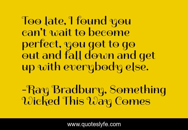 This page presents the quote "Too late, I found you can't wait to become perfect, you got to go out and fall down and get up with everybody else.". Author of this quote is Ray Bradbury, Something Wicked This Way Comes. This quote is about perfect, something-wicked-this-way-comes, life, bradbury, perfection,.