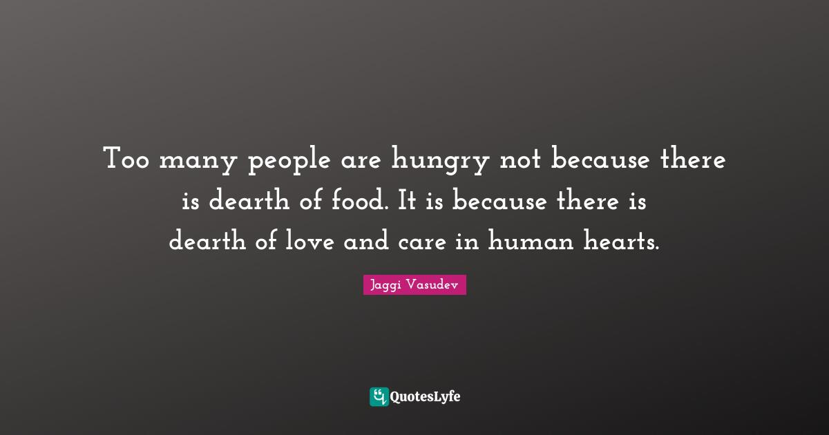 This page presents the quote "Too many people are hungry not because there is dearth of food. It is because there is dearth of love and care in human hearts.". Author of this quote is Jaggi Vasudev. This quote is about food, hungry, people, care, love and care, heart,.