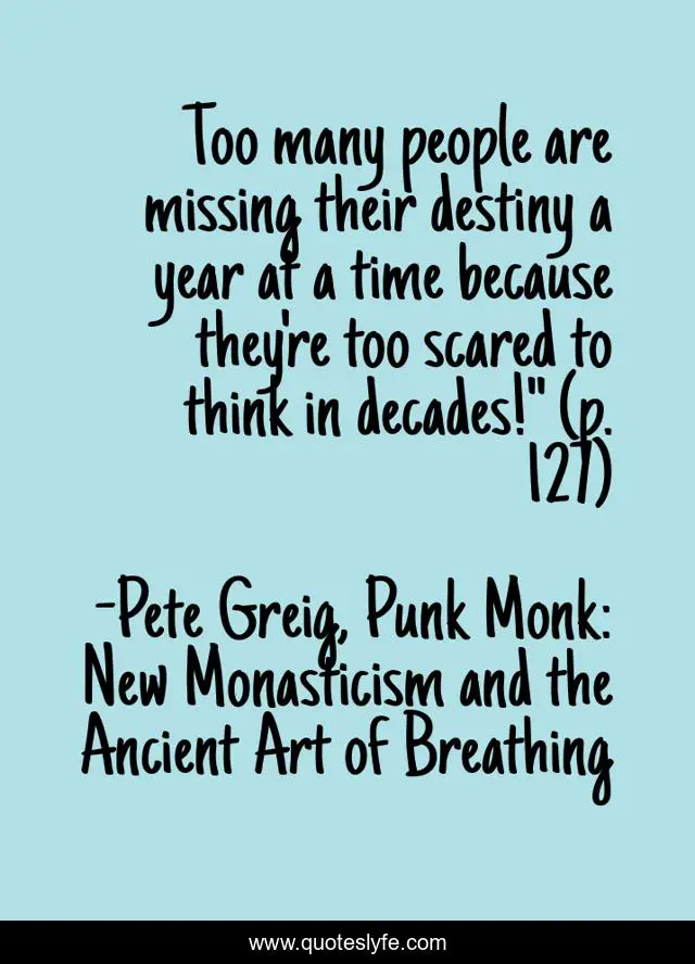 This page presents the quote "Too many people are missing their destiny a year at a time because they're too scared to think in decades!" (p. 127)". Author of this quote is Pete Greig, Punk Monk: New Monasticism and the Ancient Art of Breathing. This quote is about enthusiasm, inspirational,.