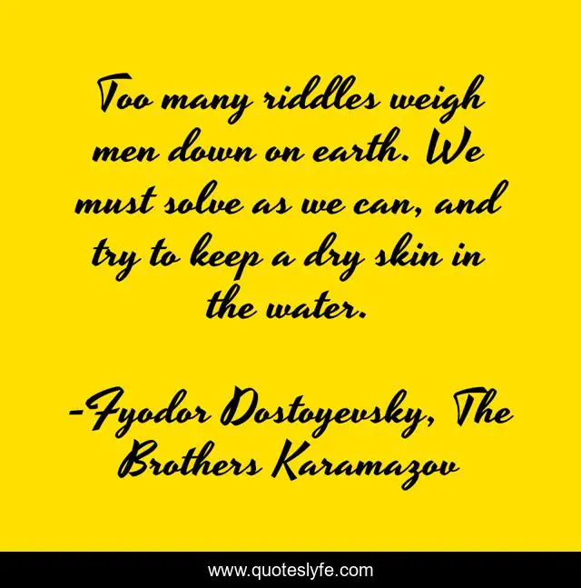 This page presents the quote "Too many riddles weigh men down on earth. We must solve as we can, and try to keep a dry skin in the water.". Author of this quote is Fyodor Dostoyevsky, The Brothers Karamazov. This quote is about life, mankind, riddles, man,.