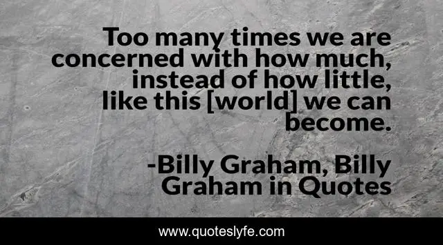 This page presents the quote "Too many times we are concerned with how much, instead of how little, like this [world] we can become.". Author of this quote is Billy Graham, Billy Graham in Quotes. This quote is about the-world, billy-graham,.