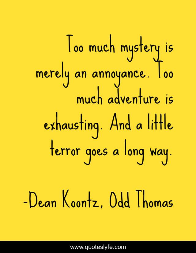 This page presents the quote "Too much mystery is merely an annoyance. Too much adventure is exhausting. And a little terror goes a long way.". Author of this quote is Dean Koontz, Odd Thomas. This quote is about mystery, terror, too-much, adventure,.