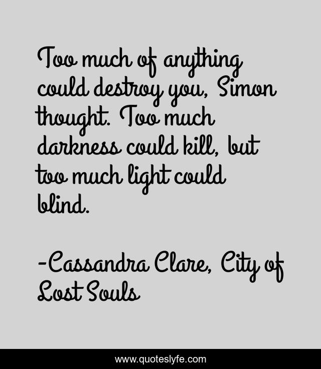 This page presents the quote "Too much of anything could destroy you, Simon thought. Too much darkness could kill, but too much light could blind.". Author of this quote is Cassandra Clare, City of Lost Souls. This quote is about light, simon-lewis, darkness, excess,.
