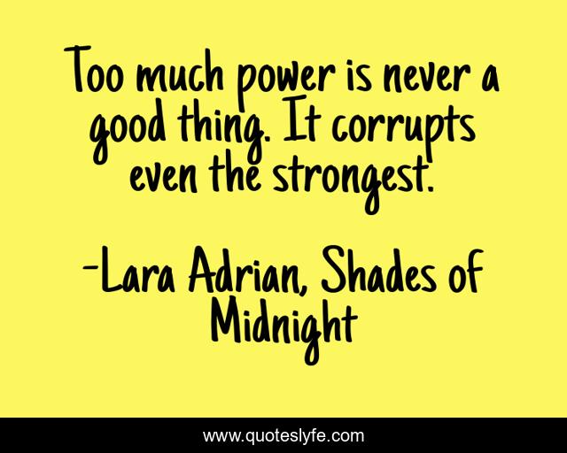 This page presents the quote "Too much power is never a good thing. It corrupts even the strongest.". Author of this quote is Lara Adrian, Shades of Midnight. This quote is about corruption, power,.