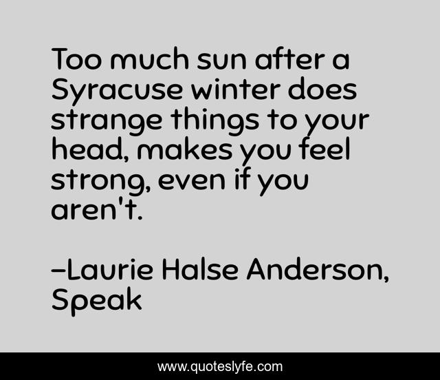 This page presents the quote "Too much sun after a Syracuse winter does strange things to your head, makes you feel strong, even if you aren't.". Author of this quote is Laurie Halse Anderson, Speak. This quote is about spring, sun, weather, winter, syracuse,.