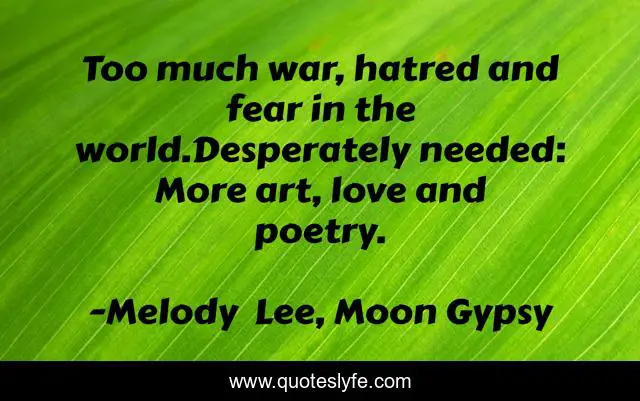 This page presents the quote "Too much war, hatred and fear in the world.Desperately needed: More art, love and poetry.". Author of this quote is Melody Lee, Moon Gypsy. This quote is about love, poetry, art, fear, hate, war, affection,.