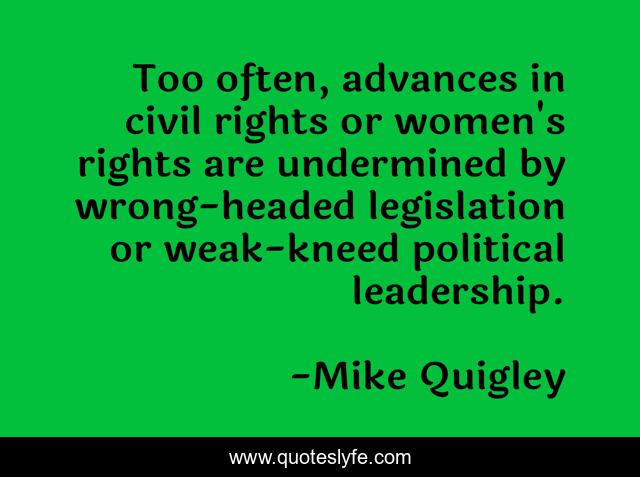 This page presents the quote "Too often, advances in civil rights or women's rights are undermined by wrong-headed legislation or weak-kneed political leadership.". Author of this quote is Mike Quigley. This quote is about women, political, rights,.