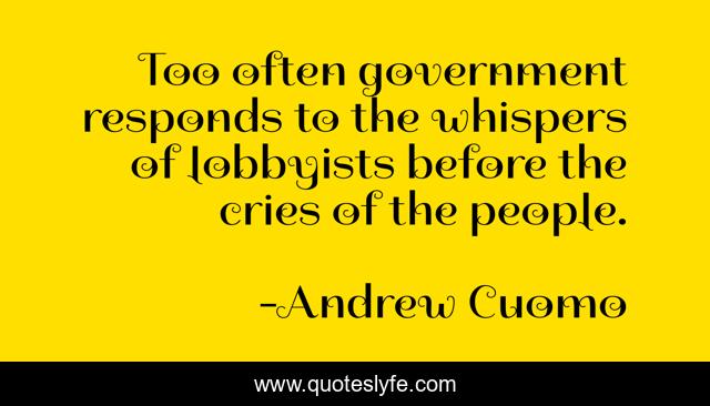 This page presents the quote "Too often government responds to the whispers of lobbyists before the cries of the people.". Author of this quote is Andrew Cuomo. This quote is about people, lobbyists, before,.