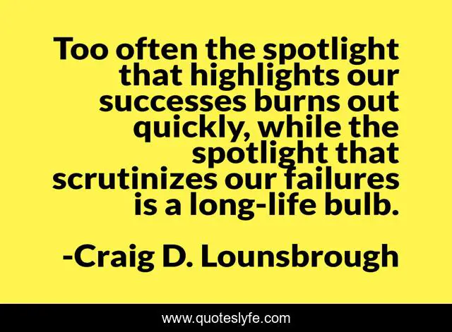 This page presents the quote "Too often the spotlight that highlights our successes burns out quickly, while the spotlight that scrutinizes our failures is a long-life bulb.". Author of this quote is Craig D. Lounsbrough. This quote is about lightbulb, success, successes, light, burn, focus, scrutiny, failure, scrutinize,.