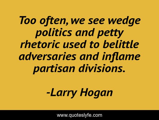 This page presents the quote "Too often, we see wedge politics and petty rhetoric used to belittle adversaries and inflame partisan divisions.". Author of this quote is Larry Hogan. This quote is about rhetoric, petty, see,.