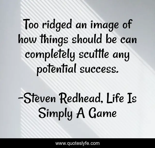 This page presents the quote "Too ridged an image of how things should be can completely scuttle any potential success.". Author of this quote is Steven Redhead, Life Is Simply A Game. This quote is about image, potential, scuttle, success,.