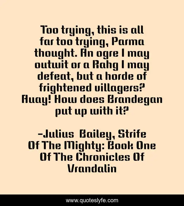 This page presents the quote "Too trying, this is all far too trying, Parma thought. An ogre I may outwit or a Rahg I may defeat, but a horde of frightened villagers? Auay! How does Brandegan put up with it?". Author of this quote is Julius Bailey, Strife Of The Mighty: Book One Of The Chronicles Of Vrandalin. This quote is about life-and-living, learning-process, weariness,.