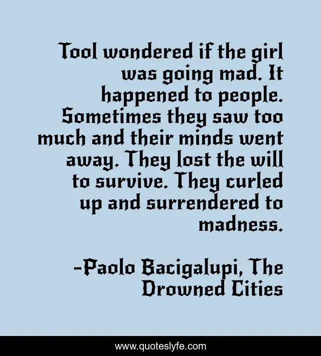 This page presents the quote "Tool wondered if the girl was going mad. It happened to people. Sometimes they saw too much and their minds went away. They lost the will to survive. They curled up and surrendered to madness.". Author of this quote is Paolo Bacigalupi, The Drowned Cities. .
