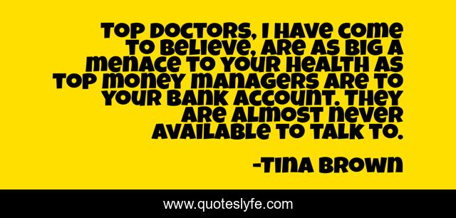 This page presents the quote "Top doctors, I have come to believe, are as big a menace to your health as top money managers are to your bank account. They are almost never available to talk to.". Author of this quote is Tina Brown. This quote is about money, believe, bank,.
