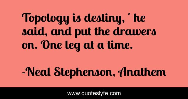 This page presents the quote "Topology is destiny, ' he said, and put the drawers on. One leg at a time.". Author of this quote is Neal Stephenson, Anathem. .
