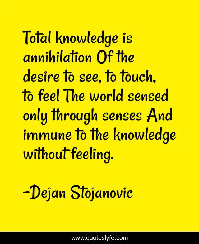 This page presents the quote "Total knowledge is annihilation Of the desire to see, to touch, to feel The world sensed only through senses And immune to the knowledge without feeling.". Author of this quote is Dejan Stojanovic. This quote is about desire, literature, knowledge, immune, feel, dejan-stojanovic, feeling, poetry, wisdom,.