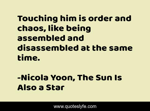This page presents the quote "Touching him is order and chaos, like being assembled and disassembled at the same time.". Author of this quote is Nicola Yoon, The Sun Is Also a Star. This quote is about attraction, love, affection,.