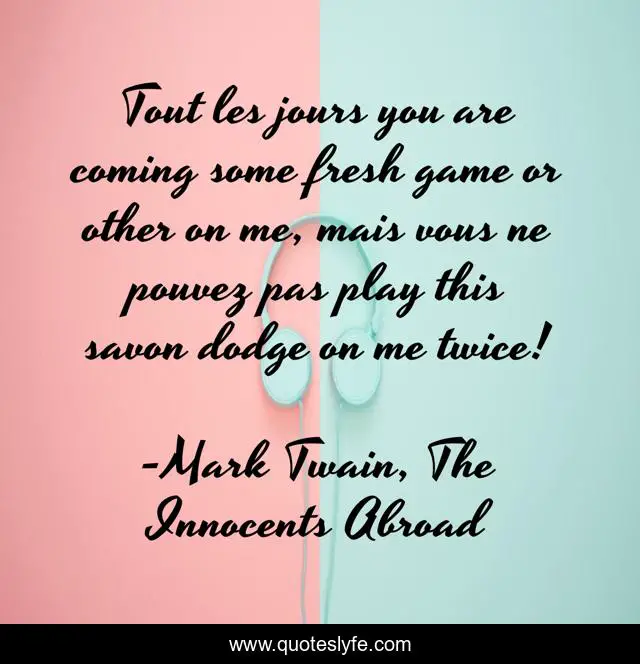 This page presents the quote "Tout les jours you are coming some fresh game or other on me, mais vous ne pouvez pas play this savon dodge on me twice!". Author of this quote is Mark Twain, The Innocents Abroad. This quote is about humor, effective-communication, tourisme, adventure, travel-writing,.
