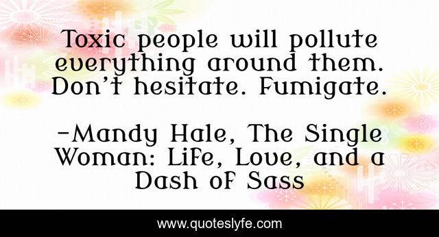 This page presents the quote "Toxic people will pollute everything around them. Don’t hesitate. Fumigate.". Author of this quote is Mandy Hale, The Single Woman: Life, Love, and a Dash of Sass. This quote is about the-single-woman, letting-go, friendship, releasing-negative-people, positive-thinking, negative-people, toxic-people, toxic-friends, loving-yourself,.