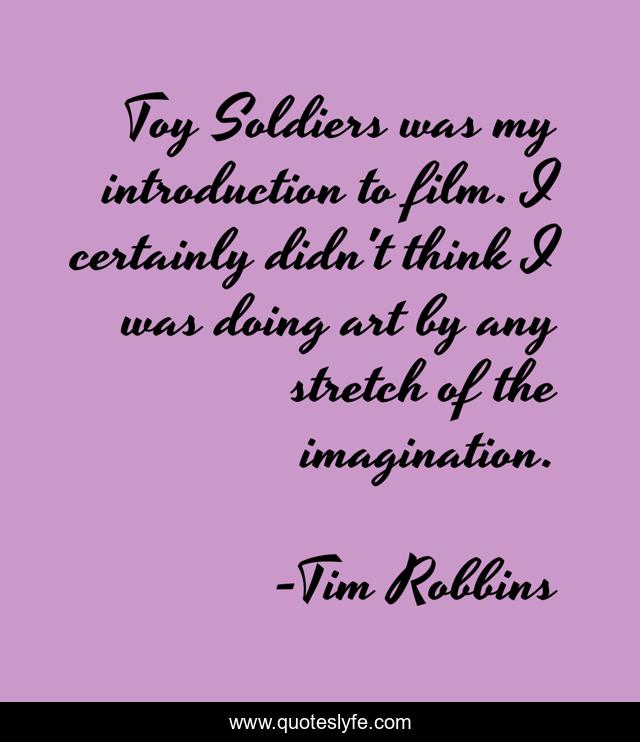 This page presents the quote "Toy Soldiers was my introduction to film. I certainly didn't think I was doing art by any stretch of the imagination.". Author of this quote is Tim Robbins. This quote is about art, think,.