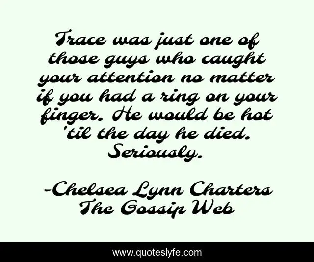 This page presents the quote "Trace was just one of those guys who caught your attention no matter if you had a ring on your finger. He would be hot 'til the day he died. Seriously.". Author of this quote is Chelsea Lynn Charters The Gossip Web. This quote is about high-school, young-adult, the-gossip-web, teenage-love, contemporary-romance,.