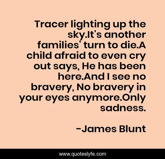 This page presents the quote "Tracer lighting up the sky.It's another families' turn to die.A child afraid to even cry out says, He has been here.And I see no bravery, No bravery in your eyes anymore.Only sadness.". Author of this quote is James Blunt. This quote is about enthusiasm, war, inspirational,.