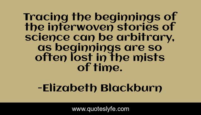 This page presents the quote "Tracing the beginnings of the interwoven stories of science can be arbitrary, as beginnings are so often lost in the mists of time.". Author of this quote is Elizabeth Blackburn. This quote is about lost, beginnings, time,.