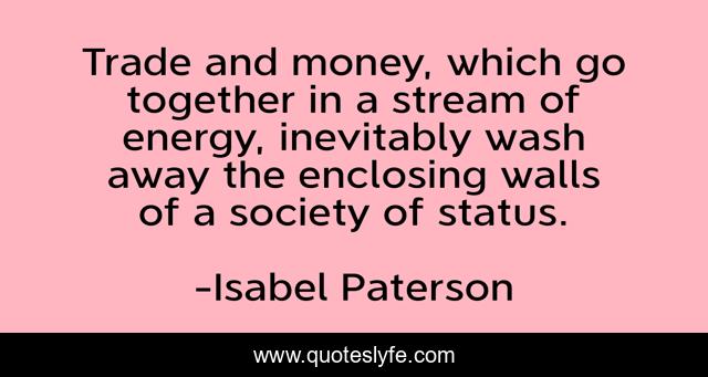 This page presents the quote "Trade and money, which go together in a stream of energy, inevitably wash away the enclosing walls of a society of status.". Author of this quote is Isabel Paterson. This quote is about free-market, freedom, liberty, austrian-school-of-economics, libertarian, voluntaryism,.
