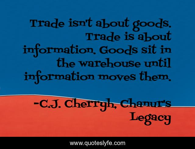 This page presents the quote "Trade isn't about goods. Trade is about information. Goods sit in the warehouse until information moves them.". Author of this quote is C.J. Cherryh, Chanur's Legacy. This quote is about warehouse, information, trade,.