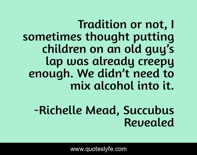 This page presents the quote "Tradition or not, I sometimes thought putting children on an old guy’s lap was already creepy enough. We didn’t need to mix alcohol into it.". Author of this quote is Richelle Mead, Succubus Revealed. This quote is about funny, comedy,.