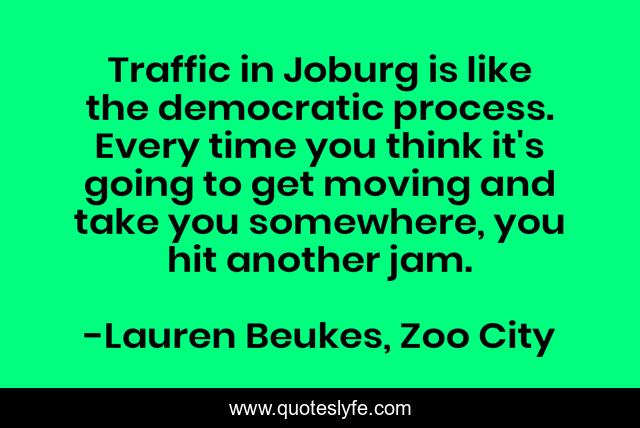 This page presents the quote "Traffic in Joburg is like the democratic process. Every time you think it's going to get moving and take you somewhere, you hit another jam.". Author of this quote is Lauren Beukes, Zoo City. This quote is about johannesburg, traffic, south-africa, democracy,.