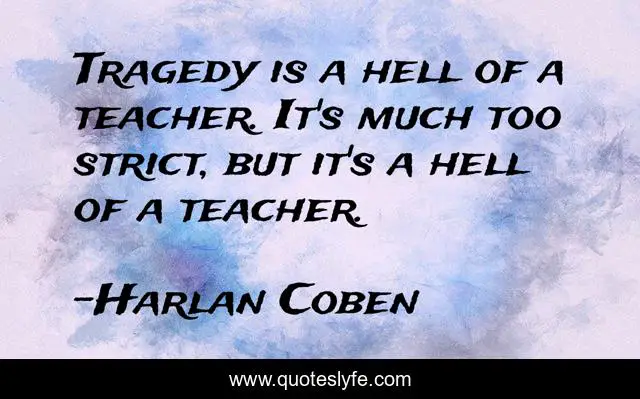 This page presents the quote "Tragedy is a hell of a teacher. It's much too strict, but it's a hell of a teacher.". Author of this quote is Harlan Coben. This quote is about hell, tragedy, too,.