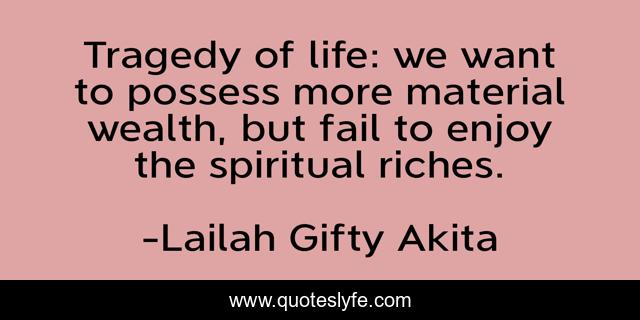 This page presents the quote "Tragedy of life: we want to possess more material wealth, but fail to enjoy the spiritual riches.". Author of this quote is Lailah Gifty Akita. This quote is about material-wealth, life, riches, spiritual, tragedy,.
