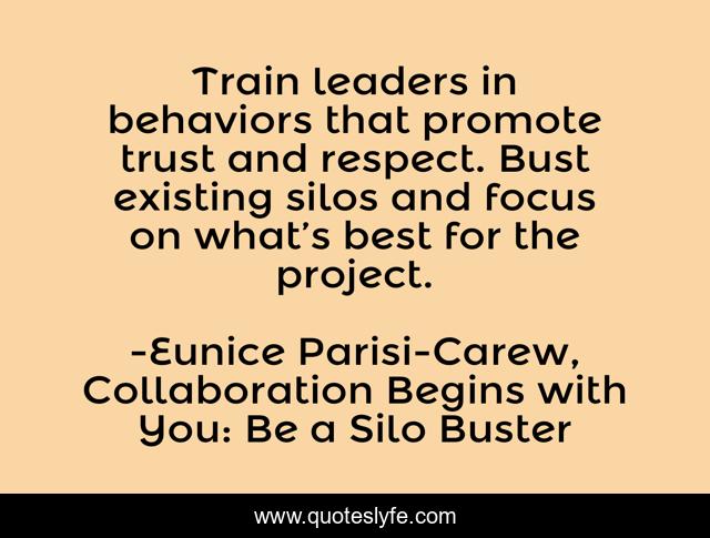 This page presents the quote "Train leaders in behaviors that promote trust and respect. Bust existing silos and focus on what’s best for the project.". Author of this quote is Eunice Parisi-Carew, Collaboration Begins with You: Be a Silo Buster. This quote is about behaviors, leaders, silos, collaboration, focus, respect, trust, projects,.