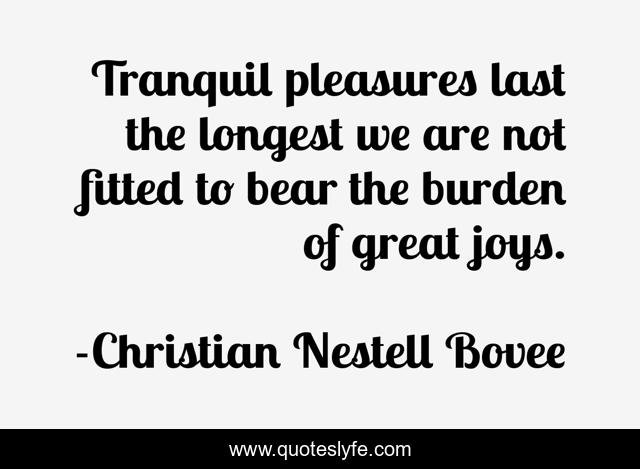 This page presents the quote "Tranquil pleasures last the longest we are not fitted to bear the burden of great joys.". Author of this quote is Christian Nestell Bovee. This quote is about pleasures, burden, bear,.