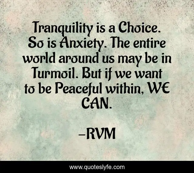 This page presents the quote "Tranquility is a Choice. So is Anxiety. The entire world around us may be in Turmoil. But if we want to be Peaceful within, WE CAN.". Author of this quote is RVM. This quote is about motivation, inspiration,.