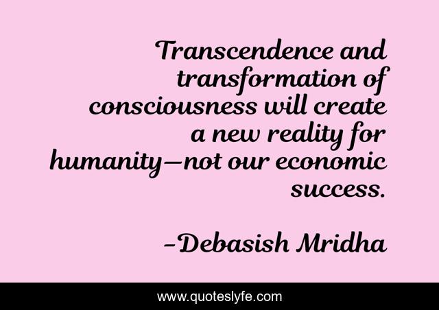 This page presents the quote "Transcendence and transformation of consciousness will create a new reality for humanity—not our economic success.". Author of this quote is Debasish Mridha. This quote is about economic-success, consciousness, philosophy, debasish-mridha, humanity, transcendence, quotes, inspirational, enthusiasm,.
