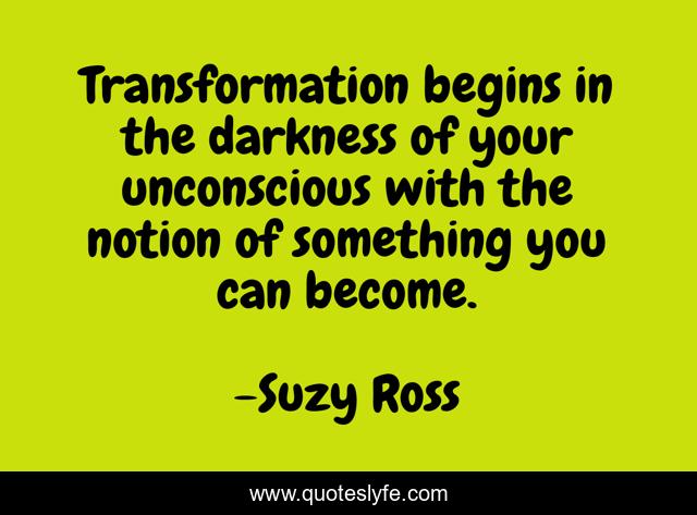 This page presents the quote "Transformation begins in the darkness of your unconscious with the notion of something you can become.". Author of this quote is Suzy Ross. This quote is about life-transformation, transformation, life-changing,.