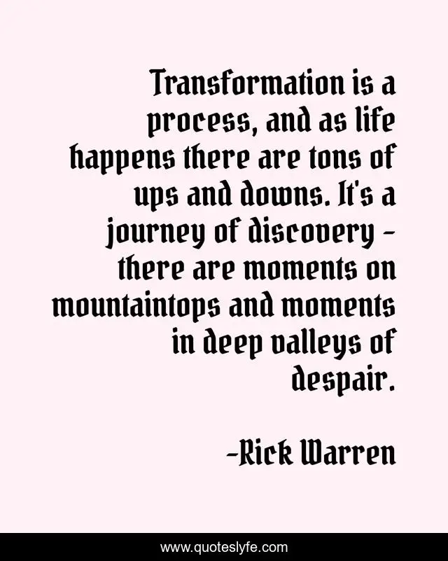 This page presents the quote "Transformation is a process, and as life happens there are tons of ups and downs. It's a journey of discovery - there are moments on mountaintops and moments in deep valleys of despair.". Author of this quote is Rick Warren. This quote is about moments, journey, deep,.