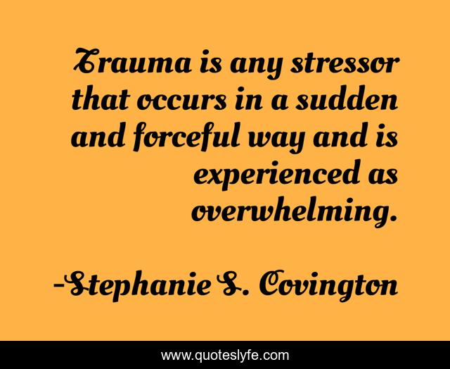 "Stephanie S. Covington Quotes." Quoteslyfe.com, 2025. Sun. 07 Dec. 2025. <https://www.quoteslyfe.com/quote/Trauma-is-any-stressor-that-occurs-in-242279>.