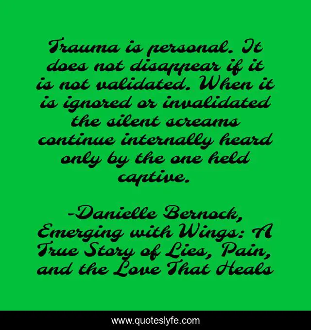 This page presents the quote "Trauma is personal. It does not disappear if it is not validated. When it is ignored or invalidated the silent screams continue internally heard only by the one held captive.". Author of this quote is Danielle Bernock, Emerging with Wings: A True Story of Lies, Pain, and the Love That Heals. This quote is about healing-the-emotional-self, pain, silenced, inner-self, silent-pain, invalidation, lies, love-heals, childhood-trauma,.