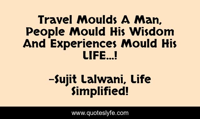 This page presents the quote "Travel Moulds A Man, People Mould His Wisdom And Experiences Mould His LIFE...!". Author of this quote is Sujit Lalwani, Life Simplified!. This quote is about life, people, travel, experience, wisdom, inspirational, world, enthusiasm,.