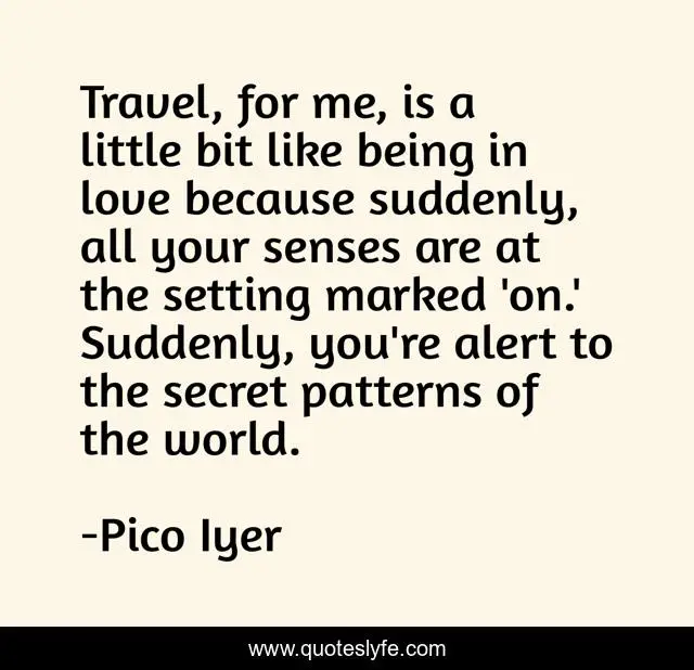 This page presents the quote "Travel, for me, is a little bit like being in love because suddenly, all your senses are at the setting marked 'on.' Suddenly, you're alert to the secret patterns of the world.". Author of this quote is Pico Iyer. This quote is about me, world, love, affection,.