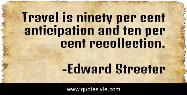 This page presents the quote "Travel is ninety per cent anticipation and ten per cent recollection.". Author of this quote is Edward Streeter. This quote is about travel, travellers,.