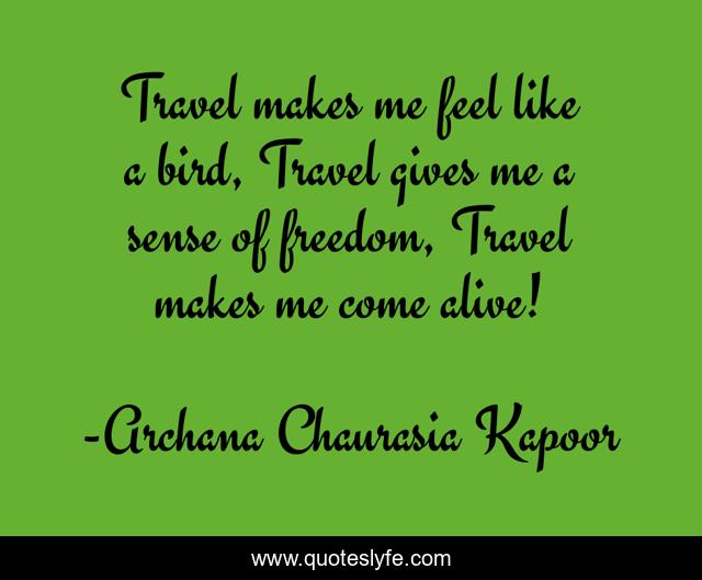 This page presents the quote "Travel makes me feel like a bird, Travel gives me a sense of freedom, Travel makes me come alive!". Author of this quote is Archana Chaurasia Kapoor. This quote is about love-for-life, travel, travel-writing, travels, traveler, freedom-of-expression,.