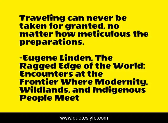 "Eugene Linden, The Ragged Edge of the World: Encounters at the Frontier Where Modernity, Wildlands, and Indigenous People Meet Quotes." Quoteslyfe.com, 2025. Mon. 08 Dec. 2025. <https://www.quoteslyfe.com/quote/Traveling-can-never-be-taken-for-granted-137589>.