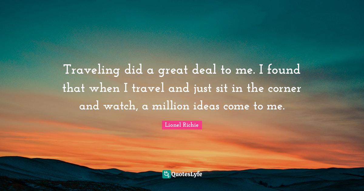 This page presents the quote "Traveling did a great deal to me. I found that when I travel and just sit in the corner and watch, a million ideas come to me.". Author of this quote is Lionel Richie. This quote is about watches, found, ideas, travel,.