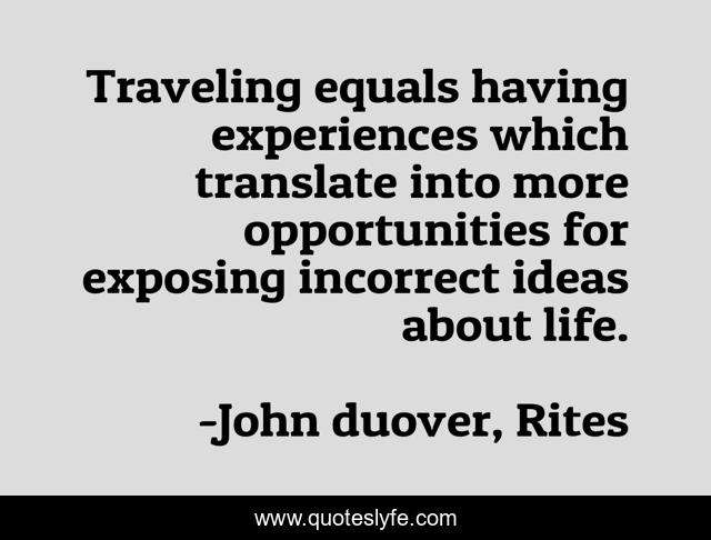 This page presents the quote "Traveling equals having experiences which translate into more opportunities for exposing incorrect ideas about life.". Author of this quote is John duover, Rites. This quote is about enthusiasm, travel, inspirational, realization,.